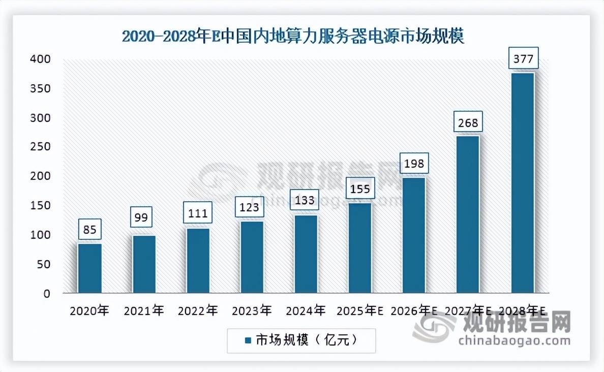 随着算力基础设施建设的推进与算力规模扩大,中国内地算力服务器电源行业实现快速发展,其市场规模从2020年的85亿元增长至2024年的133亿元,预计到2028年将跃升至377亿元,2020-2028年期间的年均复合增长率达到20.47%。
